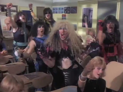 I Wanna Rock features actor Mark Metcalf, as a ferocious teacher who harasses a student for drawing the Twisted Sister logo on a book, shrieking: "What kind of a man desecrates a defenseless textbook?! I've got a good mind to slap your fat face!!" After his attempts to stop his rock-loving students and Twisted Sister fail and he crawls into the principal's office only to be confronted by the principal, played by Stephen Furst. |